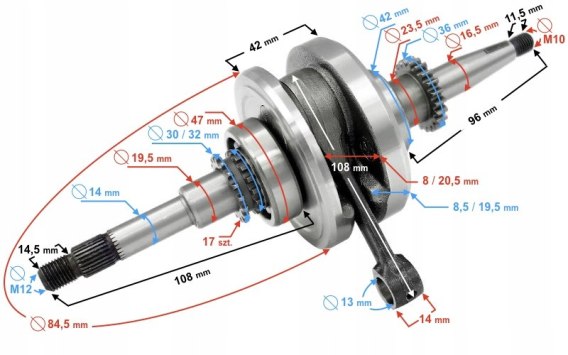 - długość całkowita dłuższego ramienia wału: 108 mm